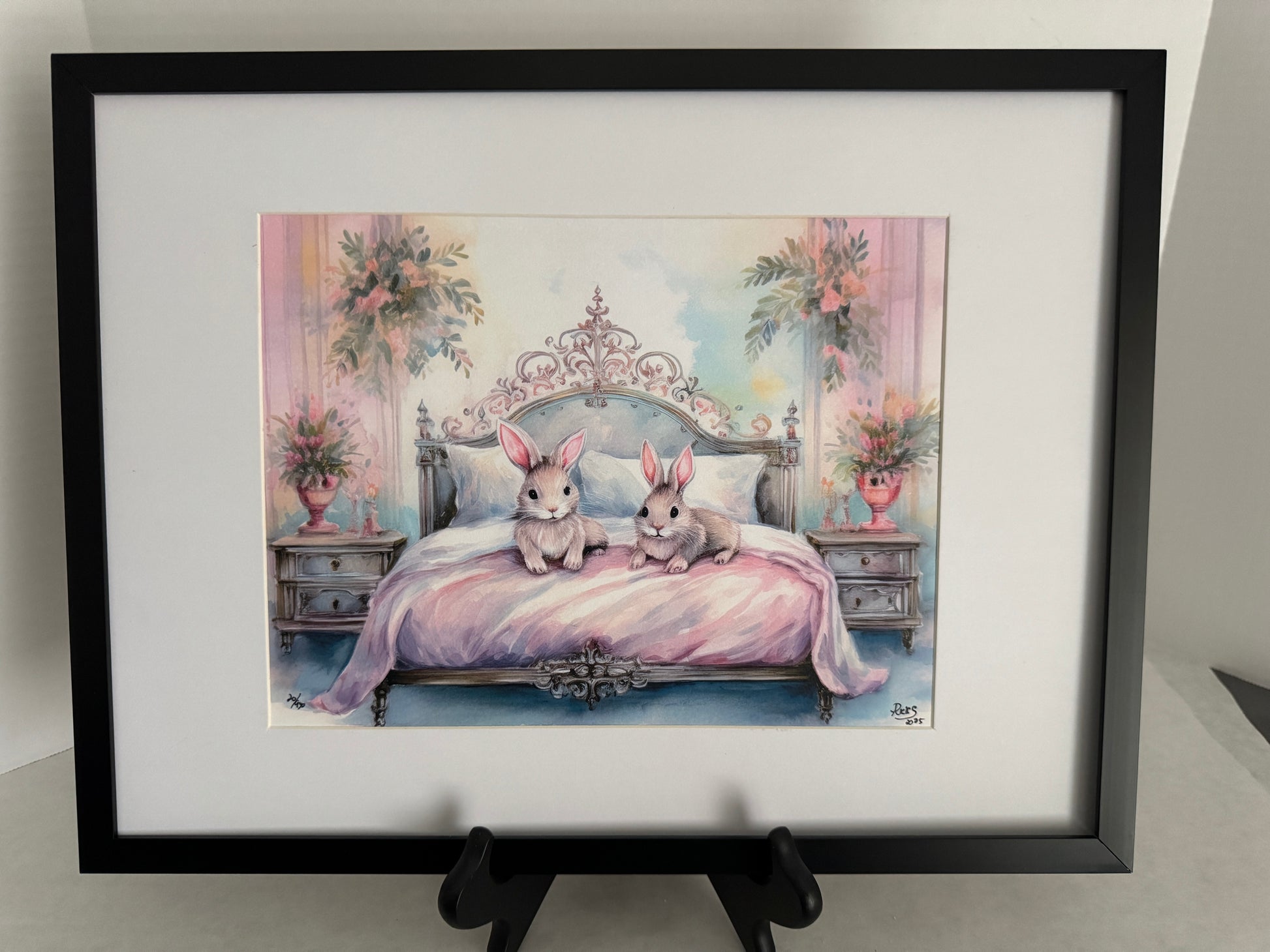 Two mischievous bunnies think they are princesses. Are they allowed on the bed? Maybe not but princesses don't care.